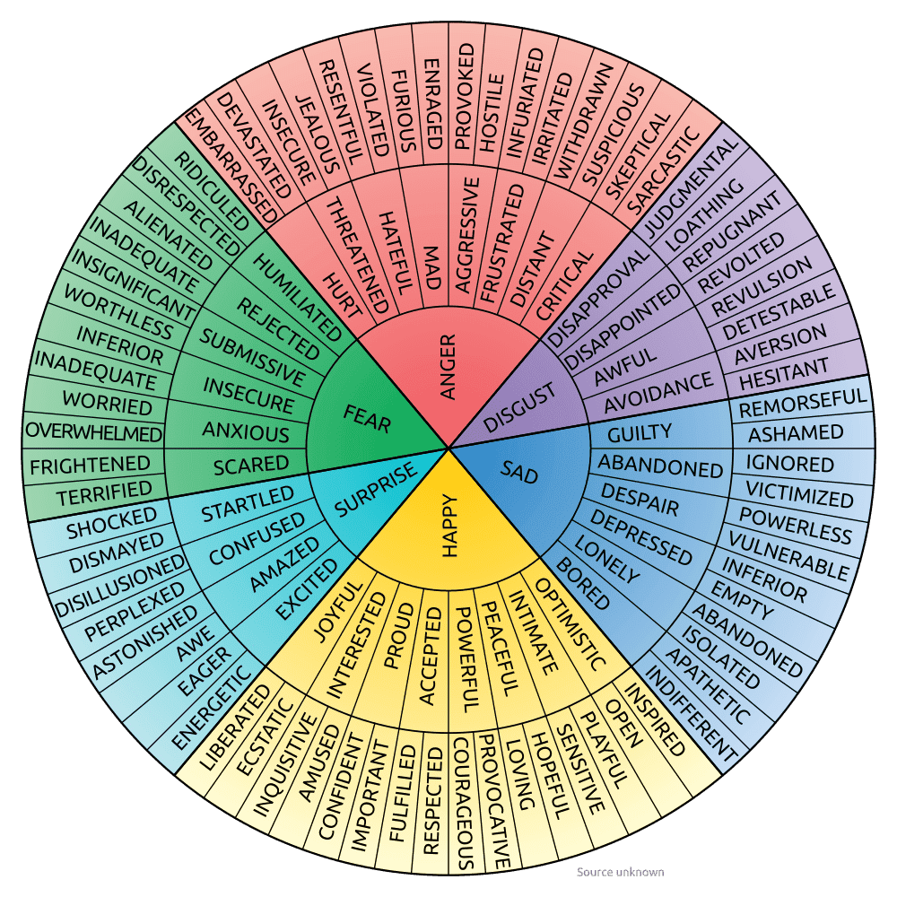 - Identify and name your emotions. Grab a feelings wheel like the one below and get familiar with identifying specific emotions. (This is especially important for teens to be able to communicate their feelings so the adults in their life can respond to the emotion before the behavior.)